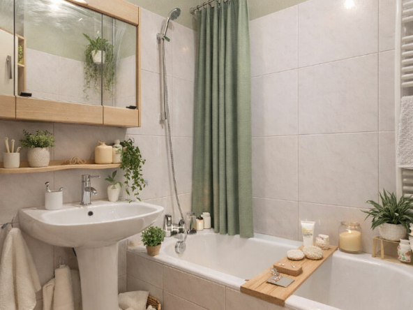 L’appartement se trouve dans un immeuble de 1980 sécurisé par un digicode, au rez de chaussée.