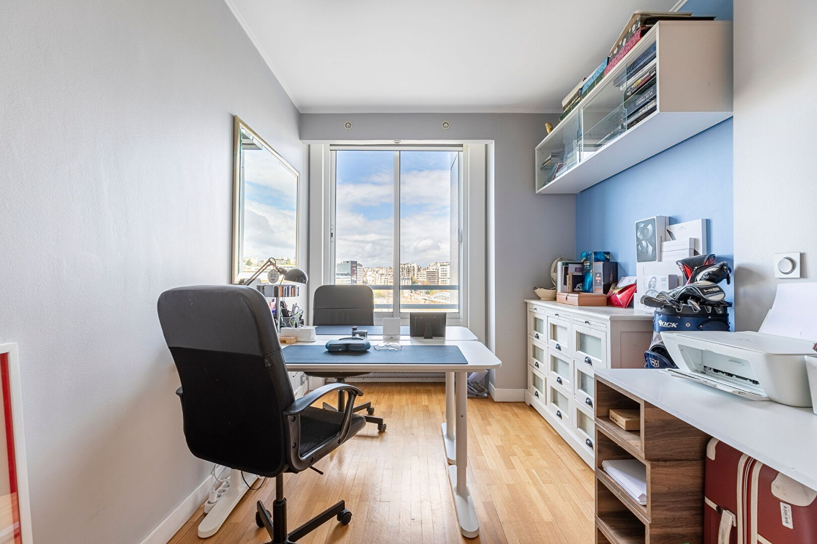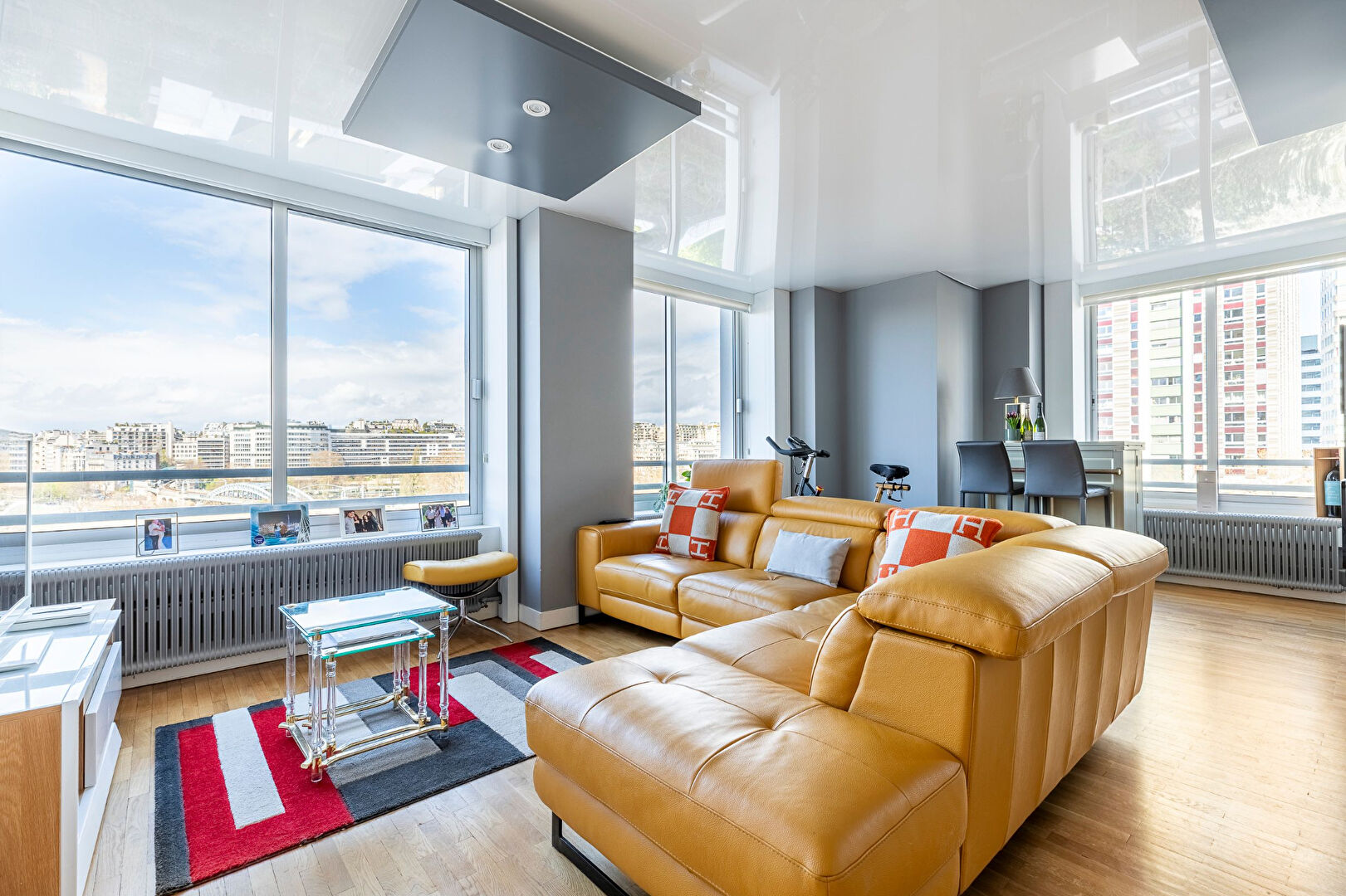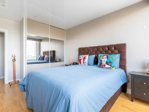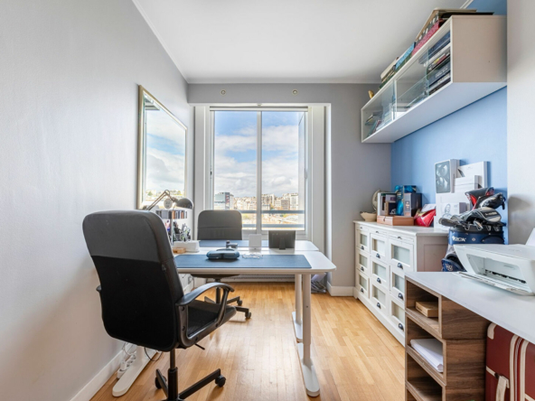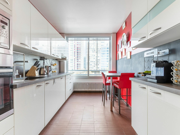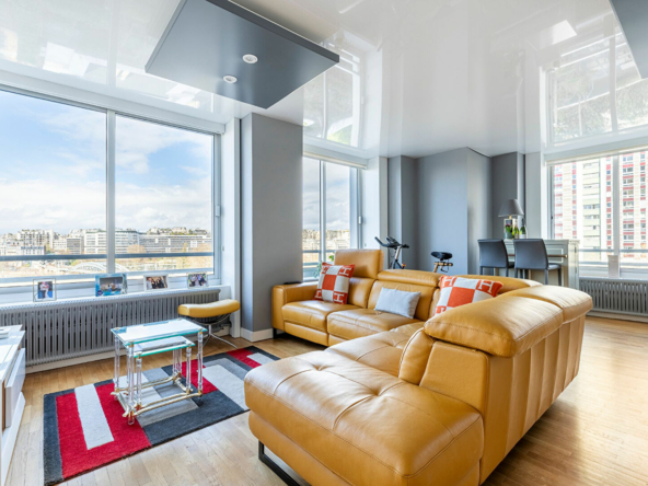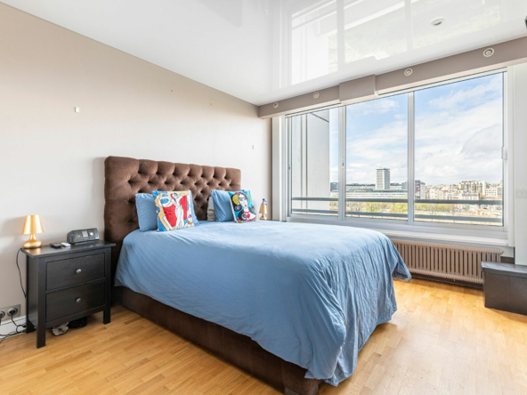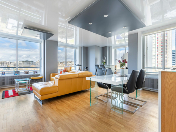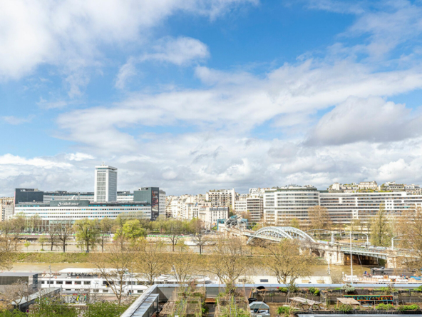 Plan en étoile desservant une entrée avec rangements, un large séjour lumineux avec une double exposition et une magnifique vue dégagée sur la Seine, une grande cuisine séparée tout équipée, trois chambres, un grand dressing, une salle d’eau avec double douche à l’italienne, un coin buanderie, un WC séparé avec lave-main.