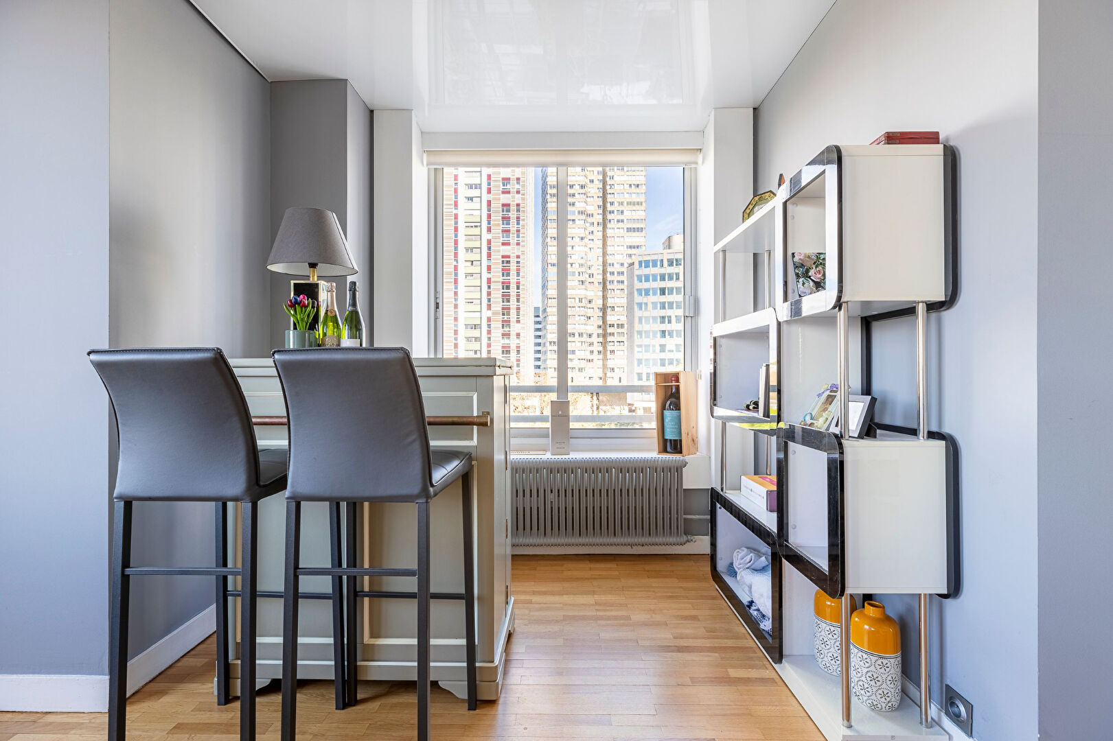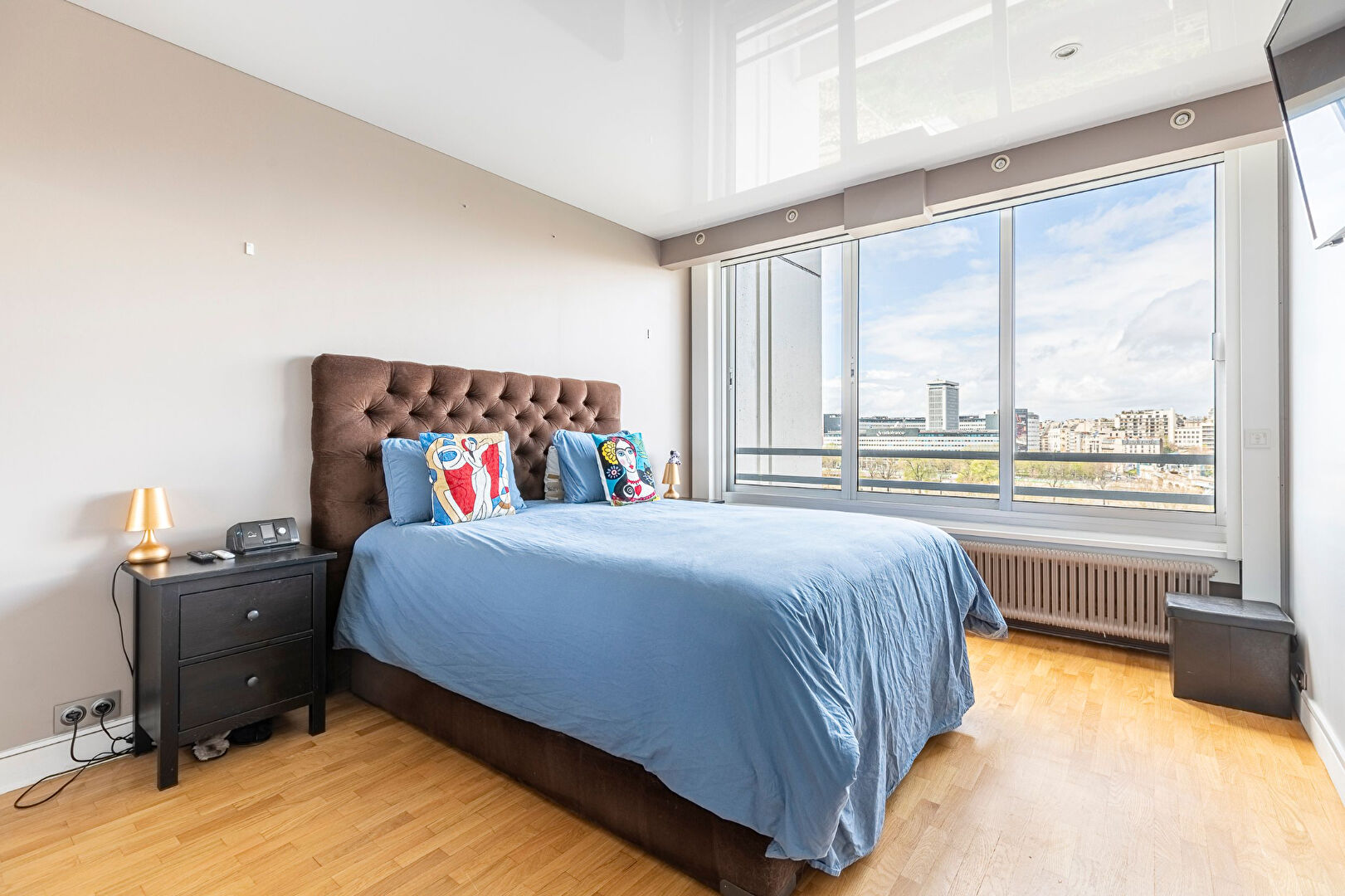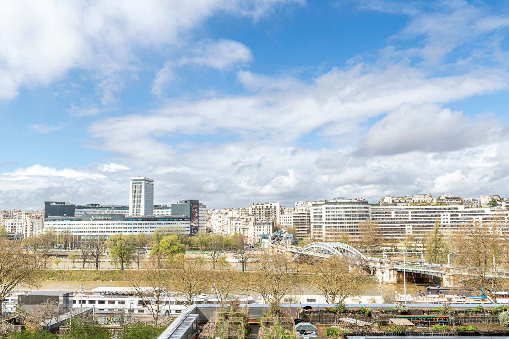 Plan en étoile desservant une entrée avec rangements, un large séjour lumineux avec une double exposition et une magnifique vue dégagée sur la Seine, une grande cuisine séparée tout équipée, trois chambres, un grand dressing, une salle d’eau avec double douche à l’italienne, un coin buanderie, un WC séparé avec lave-main.