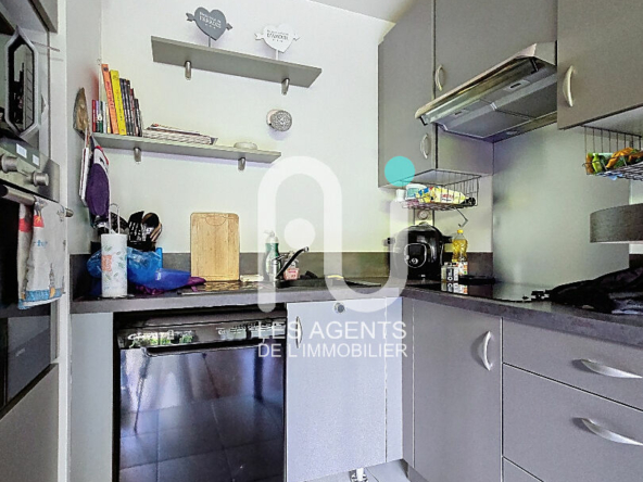 L’entrée, avec placards intégrés, mène à une belle pièce de vie comprenant un séjour lumineux et une cuisine ouverte. La chambre, spacieuse, dispose d’un dressing. L’appartement comprend également une salle de bains et des WC séparés.