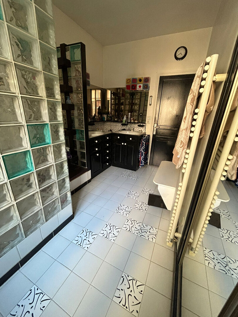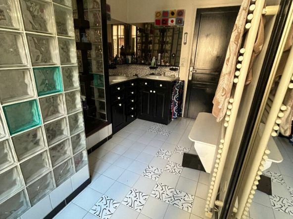 Le 1er étage se compose d’une vaste suite parentale avec dressing sur mesure, d’une deuxième chambre confortable, d’une grande salle d’eau avec double vasque, et d’un WC séparé.