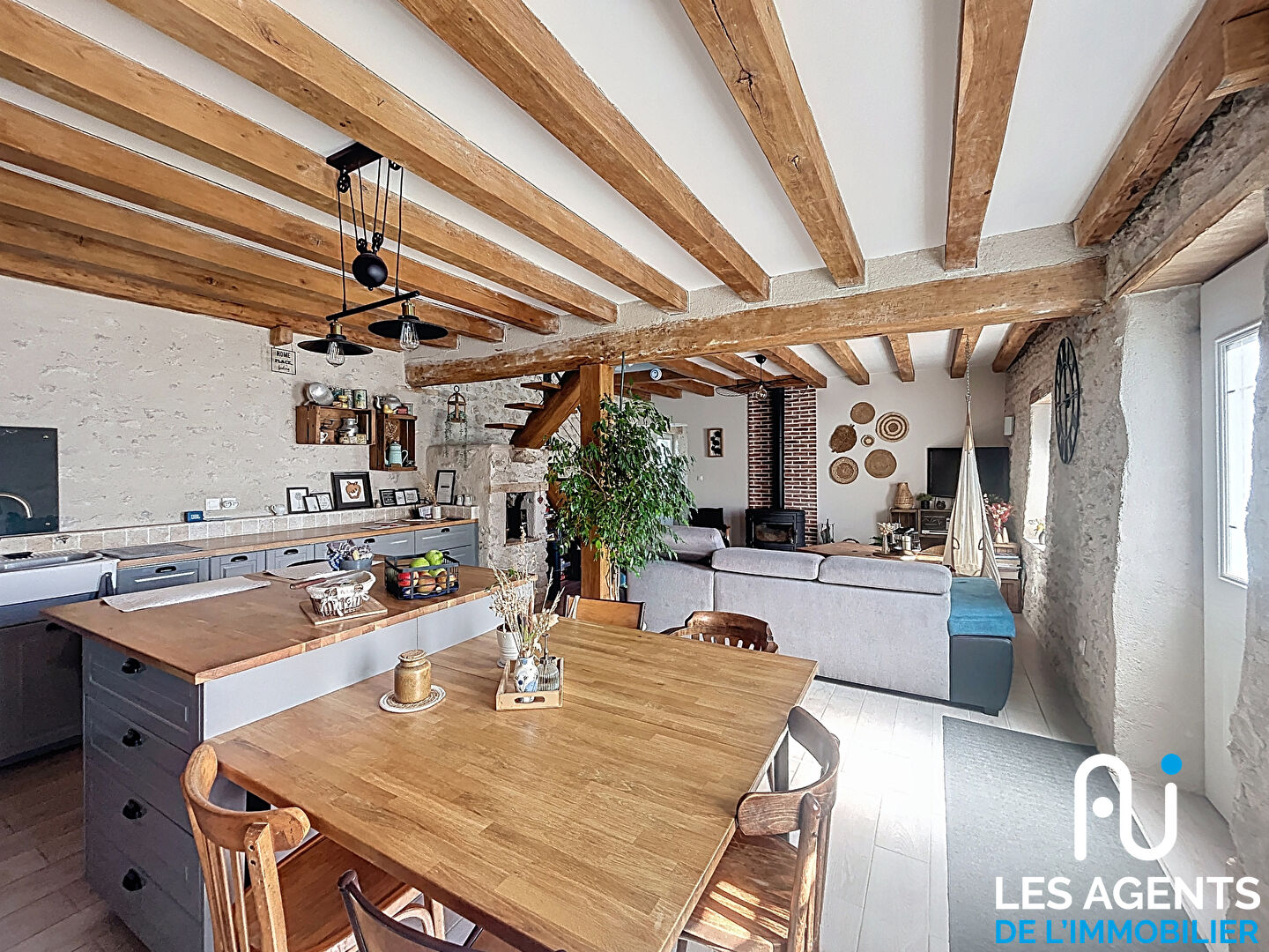 La maison se compose d’une pièce de vie chaleureuse, mise en valeur par ses poutres apparentes, ses murs en pierre et son poêle à bois, offrant une ambiance conviviale et authentique.