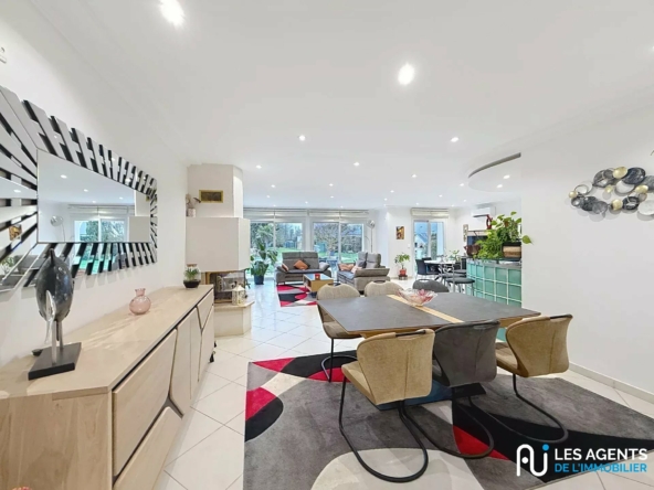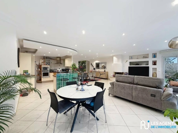 Dès l’entrée, vous serez séduits par une spacieuse pièce de vie baignée de lumière comprenant une salle à manger avec cuisine ouverte équipée d’une aspiration centralisée, ainsi qu’un double séjour convivial.