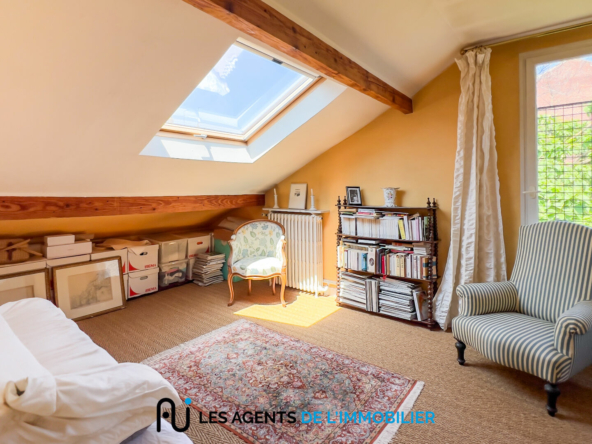 L’étage sous combles, bien optimisé, dispose de trois chambres ensoleillées, d’une salle de bains avec WC, et d’un dressing. Une surface additionnelle d’environ 40 m² en partie basse des combles (non inclus dans la surface habitable) permet des espaces de rangement supplémentaires.