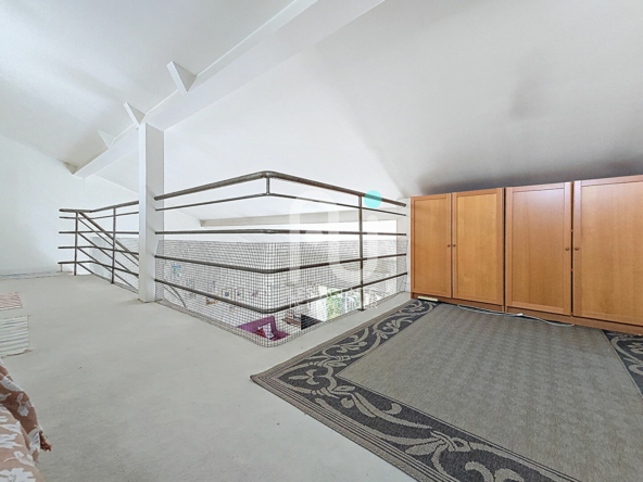 A l’étage, une mezzanine surplombant le séjour accueille un espace bureau, une troisième chambre et une seconde salle de bains avec douche, baignoire et WC.
