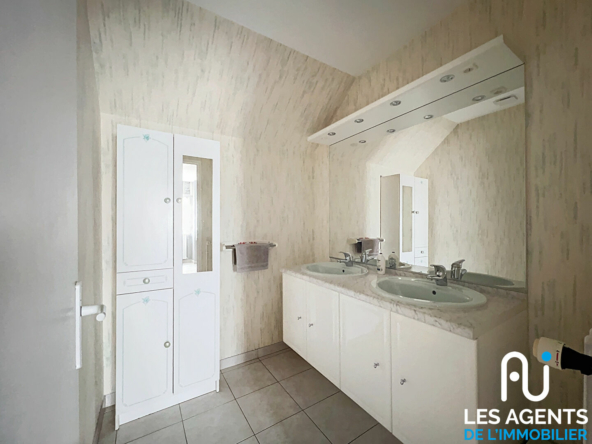 A l’étage, une grande pièce polyvalente pouvant servir de bureau ou de salle de jeux, 2 chambres avec rangements sous combles, un point d’eau avec vasque ou vous pourrez facilement y aménager une douche et pour finir un WC indépendant.