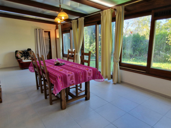 Il offre une vaste pièce de vie lumineuse avec un toit cathédrale, une véranda qui fait office de sale a manger , une cuisine aménagée équipée indépendante, un cellier, un WC, une salle d’eau et deux chambres en rez de chaussée.