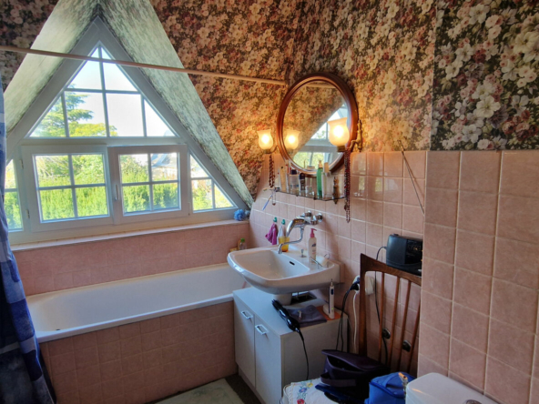 A l’étage : un pallier distribue une salle de bains, un WC, une chambre.
