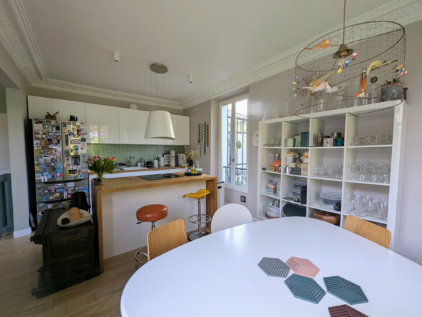 Une cuisine contemporaine dinatoire entièrement équipée, ouverte sur une salle à manger conviviale, idéale pour recevoir.