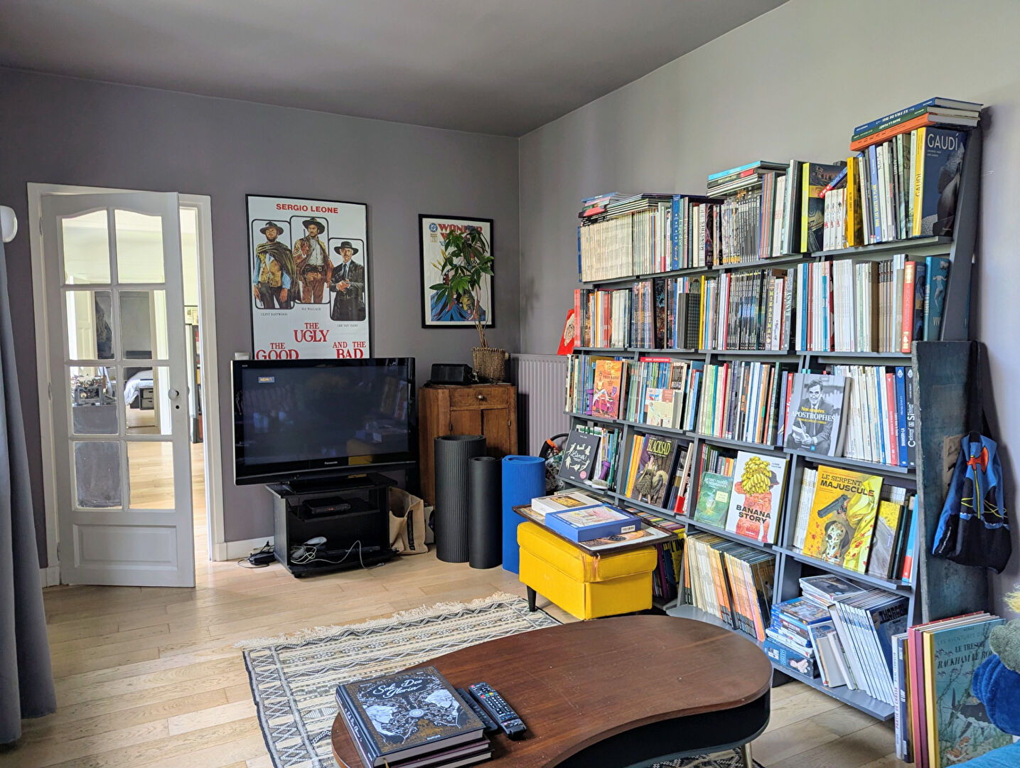 Une chambre, un salon télé et un bureau,