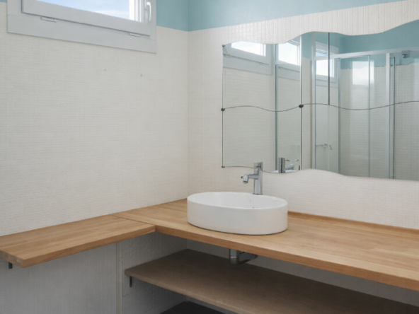 Le rez-de-chaussée surélevé comprend une entrée desservant un séjour-salon lumineux, une cuisine indépendante, une salle de bains ainsi que 2 chambres, permettant une organisation fonctionnelle et confortable des espaces de vie.