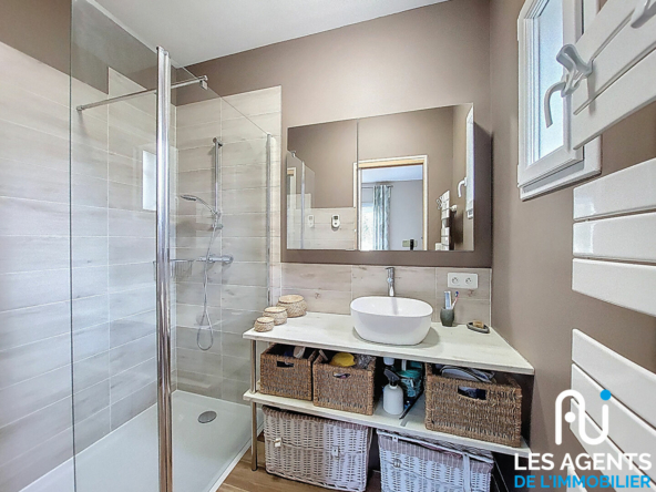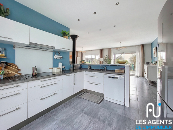 Vous entrerez au rez-de-chaussée par une entrée avec placard. Le séjour, lumineux grâce à ses baies vitrées, est desservit par un poêle à bois et donne sur une terrasse exposée sud-ouest. La cuisine ouverte est aménagée et équipée. De plain pied, vous retrouverez trois chambres dont une suite parentale avec salle d’eau et dressing, une salle de bain ainsi que des wc indépendants.