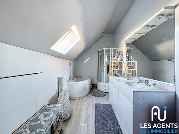 A l’étage : un palier pouvant servir de bureau, trois belles chambres et une salle de bains avec WC, offrant un confort optimal pour toute la famille.