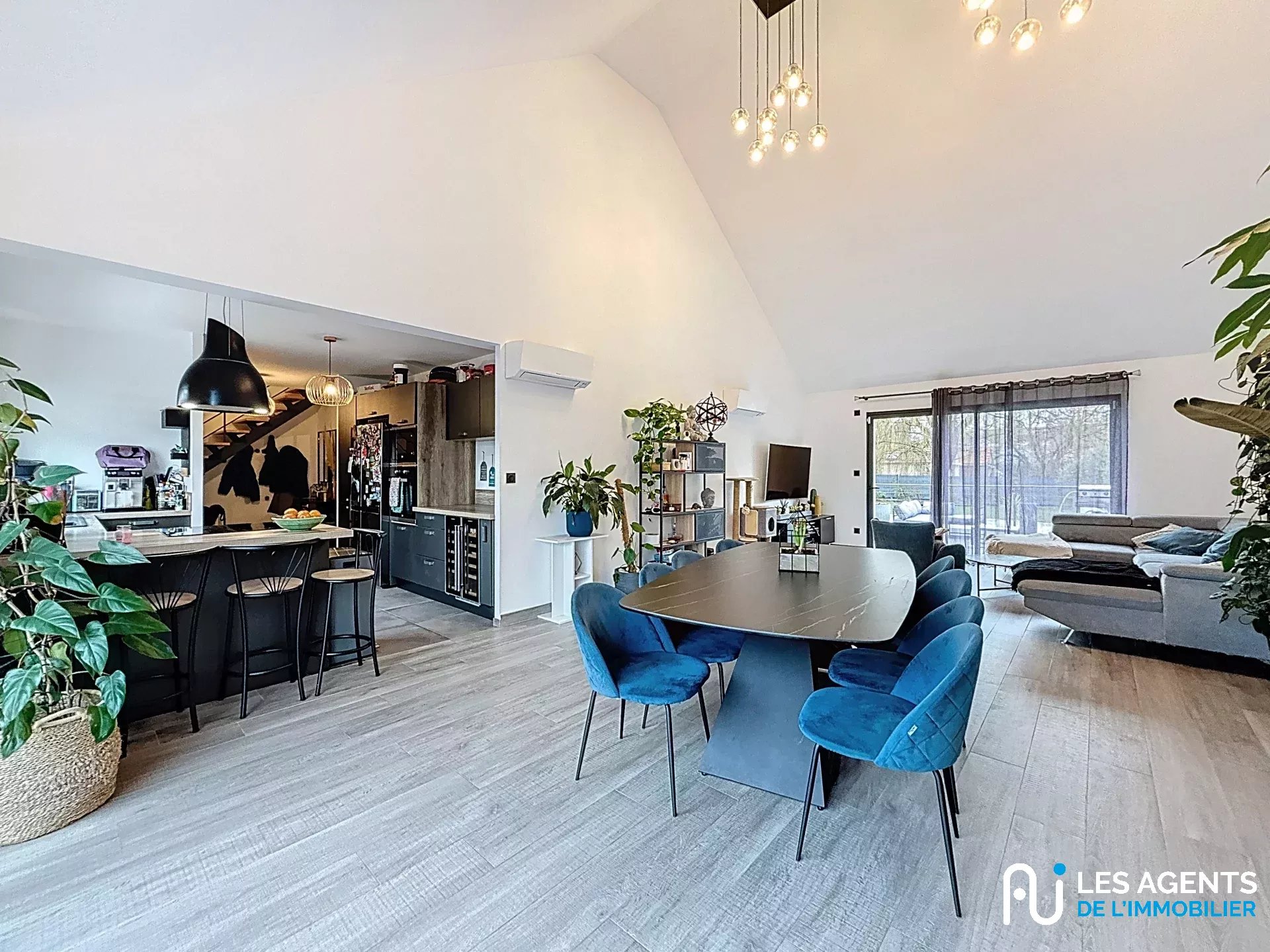 Au rez-de-chaussée, l’entrée s’ouvre sur une pièce de vie spectaculaire d’environ 55 m², composée d’une cuisine moderne ouverte et d’un séjour baigné de lumière, sublimé par un toit cathédrale apportant une belle hauteur sous plafond et une sensation d’espace incomparable.