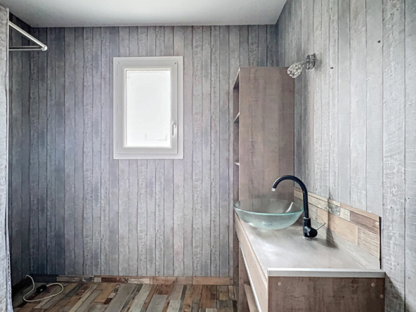 La maison se compose d’une entrée avec placard, et d’une pièce de vie comprenant salon-séjour avec cuisine de 40m². Toujours au rez-de-chaussée un couloir dessert deux chambres, une salle d’eau, un WC et un espace technique contenant la pompe à chaleur.