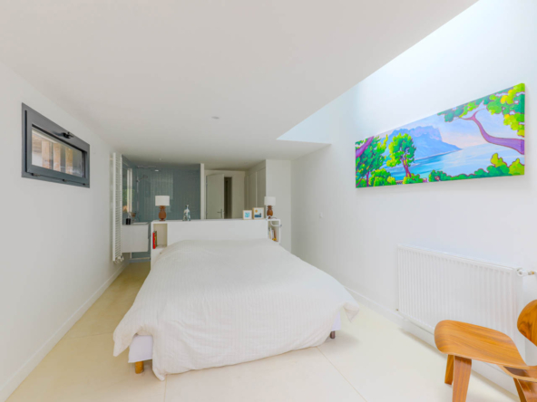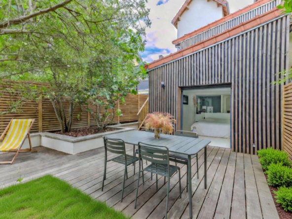 En gravissant les quelques marches du perron, vous accédez à une pièce de vie traversante et très lumineuse où le salon et une salle à manger s’articulent autour d’une magnifique cuisine ouverte tout équipée. Une porte-fenêtre s’ouvre sur une première terrasse surplombant un vaste jardin arboré. Le premier étage se compose de 2 chambres spacieuses avec chacune une grande mezzanine, ainsi qu’une salle de bains avec WC. Au rez de jardin, une suite parentale avec salle d’eau et dressing s’ouvre par une large baie vitrée sur le jardin arboré et une seconde terrasse. A ce niveau, une seconde suite parentale avec une grande salle d’eau, WC et coin cuisine pouvant être un studio bénéficiant de 2 accès : par la maison et par l’extérieur pour une totale autonomie. Une buanderie et de nombreux placards complètent cette belle proposition. L’agencement soigné de cette maison et ses finitions premium conjugués au charme qui s’en dégage en font un bien exceptionnel.