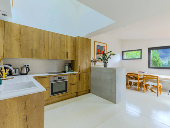 En gravissant les quelques marches du perron, vous accédez à une pièce de vie traversante et très lumineuse où le salon et une salle à manger s’articulent autour d’une magnifique cuisine ouverte tout équipée. Une porte-fenêtre s’ouvre sur une première terrasse surplombant un vaste jardin arboré. Le premier étage se compose de 2 chambres spacieuses avec chacune une grande mezzanine, ainsi qu’une salle de bains avec WC. Au rez de jardin, une suite parentale avec salle d’eau et dressing s’ouvre par une large baie vitrée sur le jardin arboré et la terrasse. A ce niveau, une seconde suite parentale avec une grande salle d’eau, WC et coin cuisine pouvant être un studio bénéficiant de 2 accès : par la maison et par l’extérieur pour une totale autonomie. Une buanderie et de nombreux placards complètent cette belle proposition. L’agencement soigné de cette maison et ses finitions premium conjugués au charme qui s’en dégage en font un bien exceptionnel.