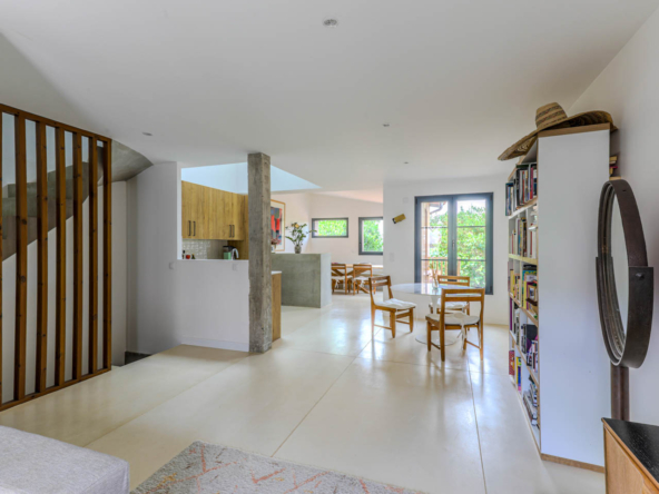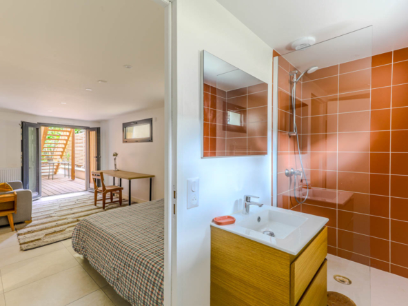 En gravissant les quelques marches du perron, vous accédez à une pièce de vie traversante et très lumineuse où le salon et une salle à manger s’articulent autour d’une magnifique cuisine ouverte tout équipée. Une porte-fenêtre s’ouvre sur une première terrasse surplombant le jardin arboré. Le premier étage se compose de 2 chambres spacieuses avec chacune une grande mezzanine, ainsi qu’une salle de bains avec WC. Au rez de jardin, une suite parentale avec salle d’eau et dressing s’ouvre par une large baie vitrée sur le jardin arboré et la terrasse. A ce niveau, une seconde suite parentale avec une grande salle d’eau, WC et coin cuisine pouvant être un studio bénéficiant de 2 accès : par la maison et par l’extérieur pour une totale autonomie. Une buanderie et de nombreux placards complètent cette belle proposition. L’agencement soigné de cette maison et ses finitions premium conjugués au charme qui s’en dégage en font un bien exceptionnel.