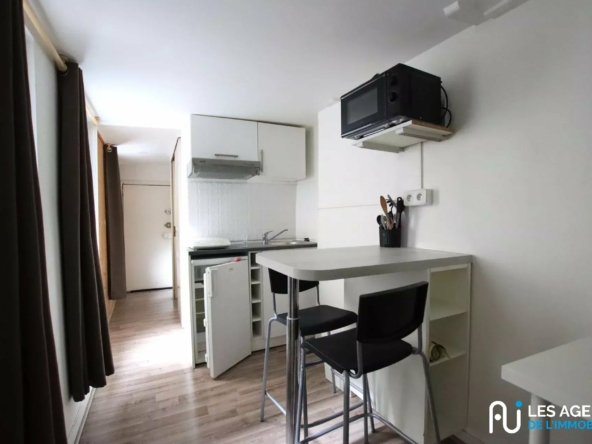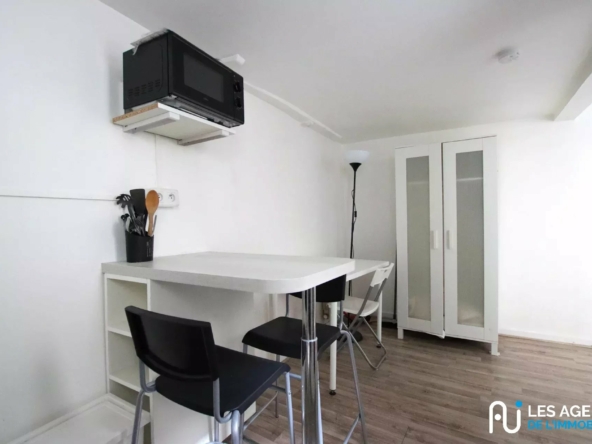 Le logement se compose d’une pièce principale lumineuse, d’une kitchenette équipée (plaques de cuisson, réfrigérateur, rangements) et d’une salle d’eau avec douche et WC.