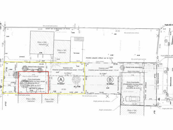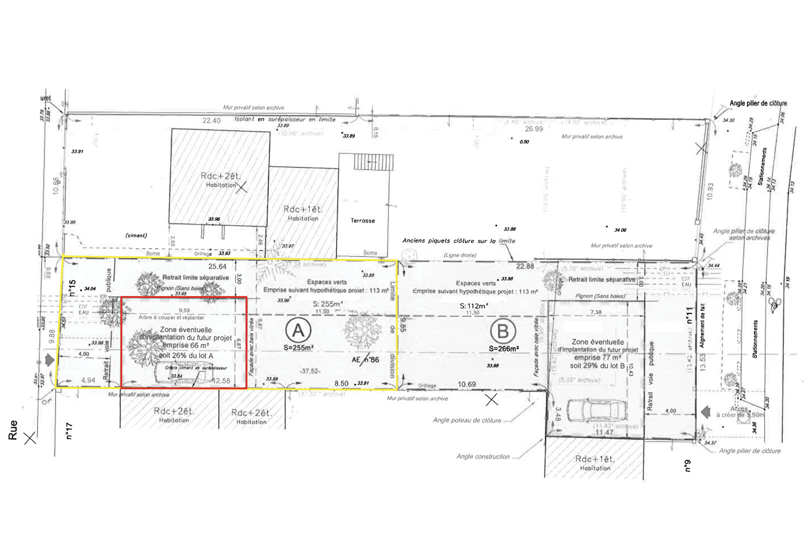 Possibilité de construction d’une maison avec une emprise au sol d’environ 66 m², sur deux niveaux plus combles.